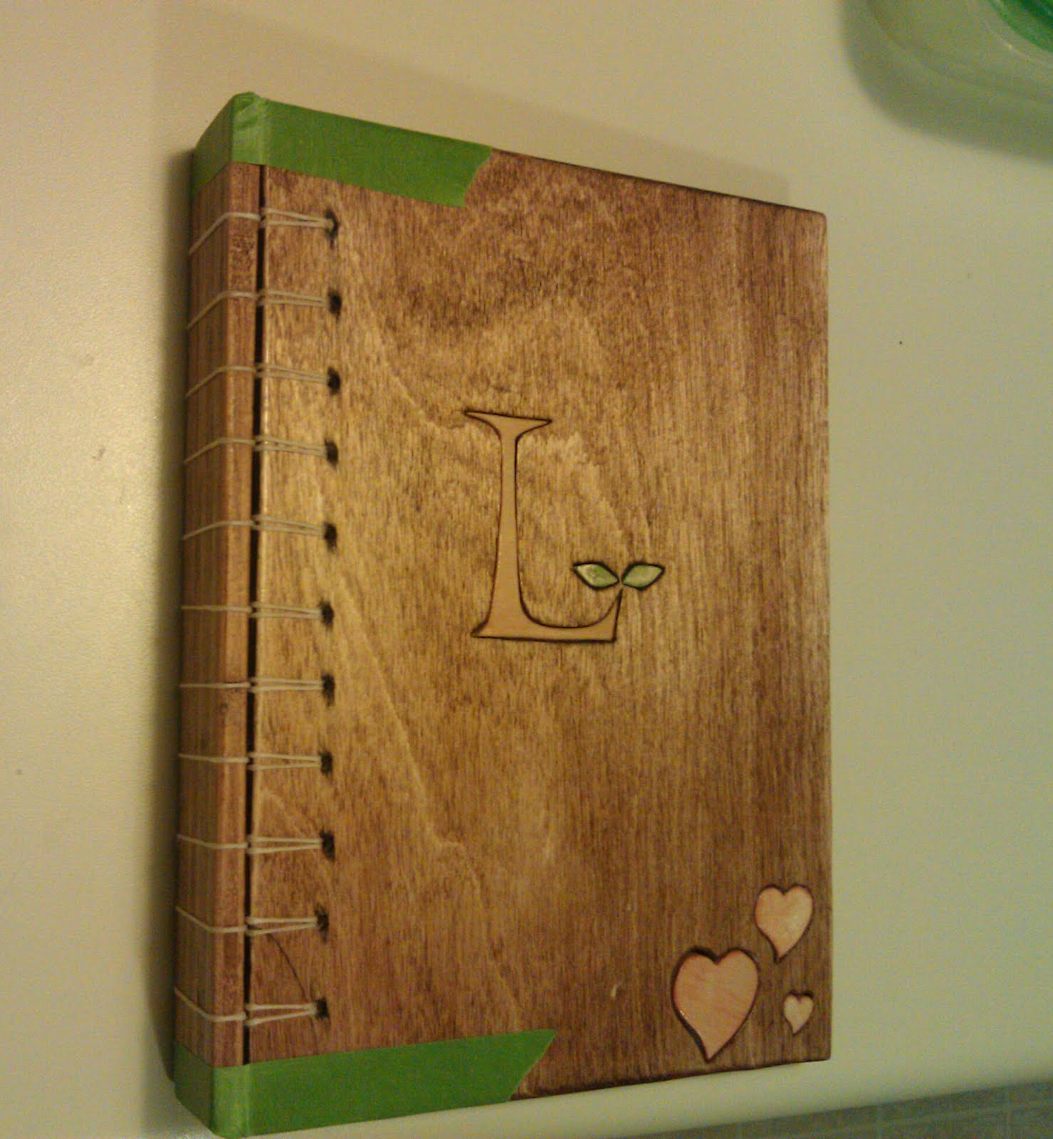 Once the stain dried I glued the pieces into the holes. For this project, the little gaps didn't matter so I didn't bother filling them in. I drilled holes in the covers and then polyurethaned them and the spine. I followed the Belgian Book Binding instructions from here. I used 5 sheets cream colored paper folded in half per signature and I also added some green cardstock inside both covers. I used waxed linen string for the binding.